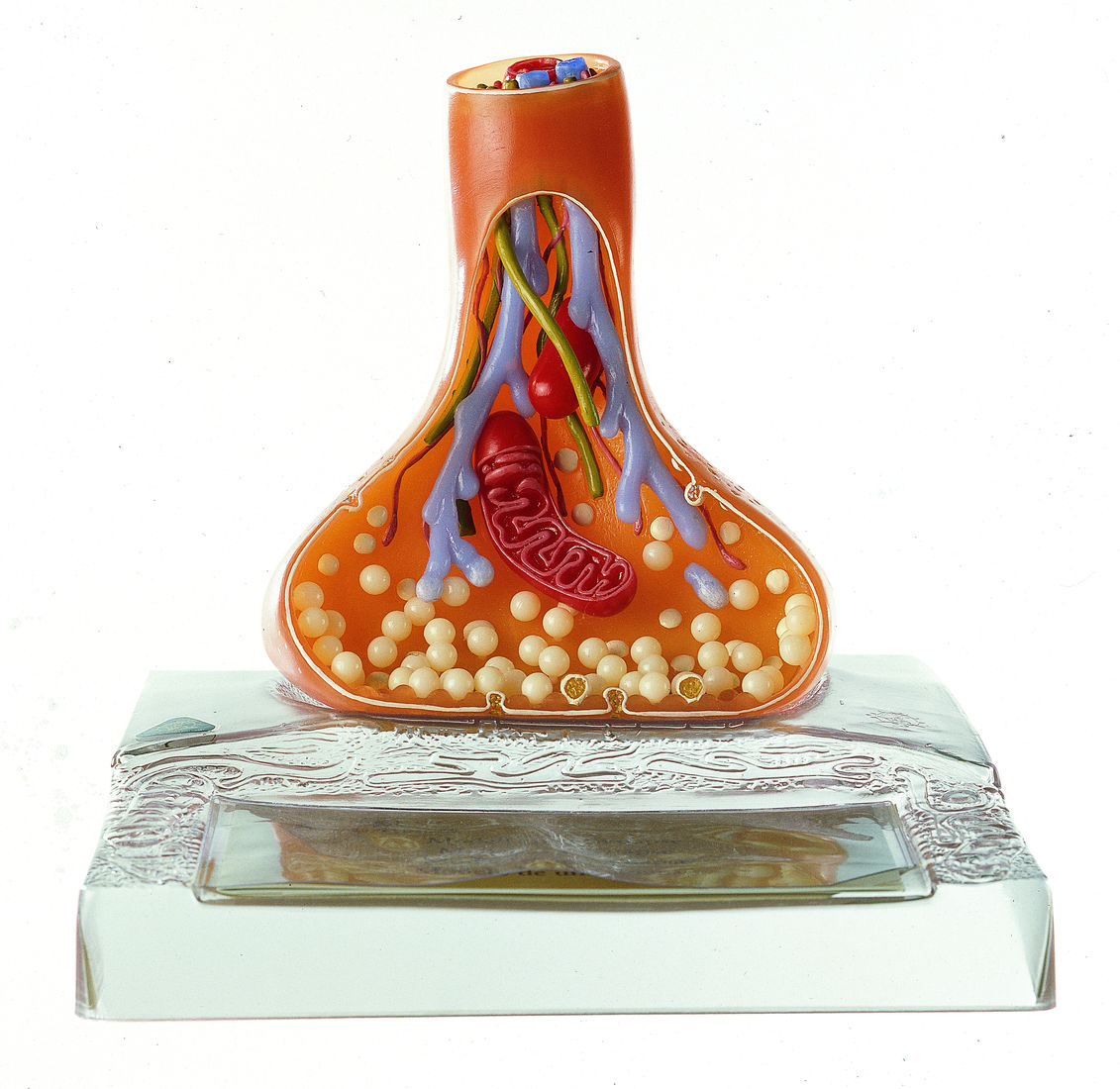 Vergrößerung ca. 2500fach, aus SOMSO-Plast®. Bestehend aus Nervenzellkörper und markhaltiger Nervenfaser. Nach elektronenmikroskopischen Befunden. Insgesamt in 3 Teile zerlegbar. Abnehmbar auf Sockel.