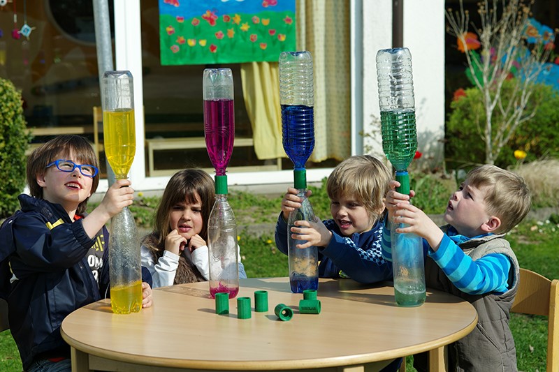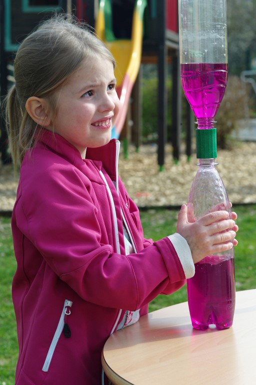 Eine Versuchsmöglichkeit ist: Kinder machen Luft in Form aufsteigender Blasen sichtbar. Daraus ergeben sich vielfältige Möglichkeiten zum Forschen. Zum einen entdecken sie , dass Luft Raum einnimmt und dass an einer Stelle im Raum niemals zwei Dinge gleichzeitig sein können. Zum anderen kann mit den beiden übereinander verschraubten Flaschen ein „Wassertornado' in der Flasche erzeugt werden. Dabei haben die Kinder die Möglichkeit, den Strudel von allen Seiten genau zu beobachten. Vorgehensweise Die Kinder füllen eine der beiden Flaschen zu etwa 2/3 voll mit Wasser und geben Farbstoff dazu. Nun wird das Verbindungsstück fest auf die Flasche geschraubt, die leere Flasche aufgesetzt und ebenfalls eingeschraubt. Nun sollten die Kinder abwechselnd unten oder oben auf die Flasche drücken und dabei ihre Beobachtungen machen. Thematisieren Sie, dass erst Platz frei werden muss, damit Wasser nach unten bzw. Luft nach oben gelangen kann. Wird also auf die untere Flasche gedrückt, dann steigen Luftblasen nach oben. Den dadurch unten frei gewordenen Platz nimmt Wasser ein, wenn der Druck auf die untere Flasche nachlässt.