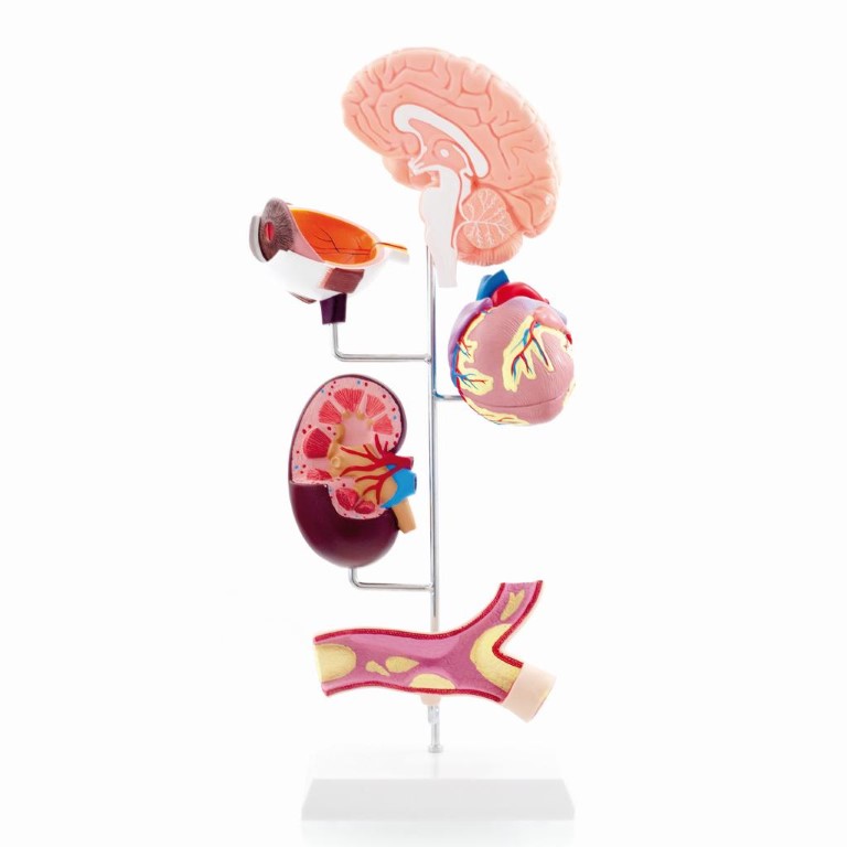 Dieses Modell der Bluthochdruck-Folgen erklärt die häufigsten Organschäden durch Bluthochdruck anhand der Miniaturen von Gehirn, Auge, Herz, Niere und einer pathologisch vergrößerten Arterie. Das Lehrmodell beschreibt anschaulich die typischen, durch Bluthochdruck verursachten Krankheitsbilder (Glaukom, Gelenkentzündung, Arteriosklerose, Nierenversagen und Schlaganfall)