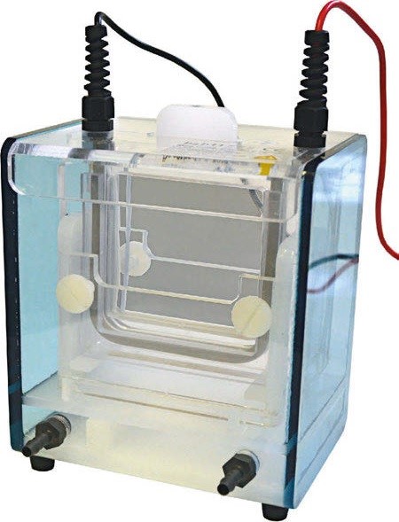 Kompakte Elektrophoresekammer aus hochwertigem Plexiglas zur Trennung von Proteinen in Polyacrylamid- Fertiggelen (10x10cm).