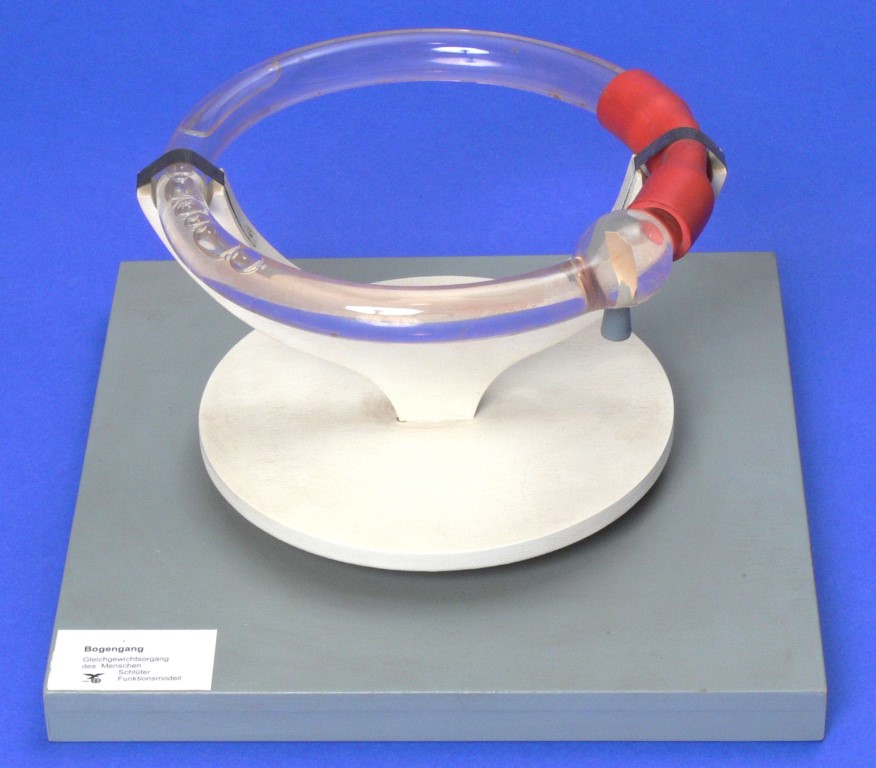 Bei diesem Modell wird die Wirkung des Gehörwassers auf die Sinneshaarzellen durch Drehen einer mit Flüssigkeit gefüllten Glasröhre (Bogengang) gezeigt. Ein senkrecht zur Glasröhre aufgestelltes Gummiplättchen legt sich in die entgegengesetzte Drehrichtung. Auch die Darstellung des „Drehwurmes" ist möglich; Lieferung mit Begleittext.