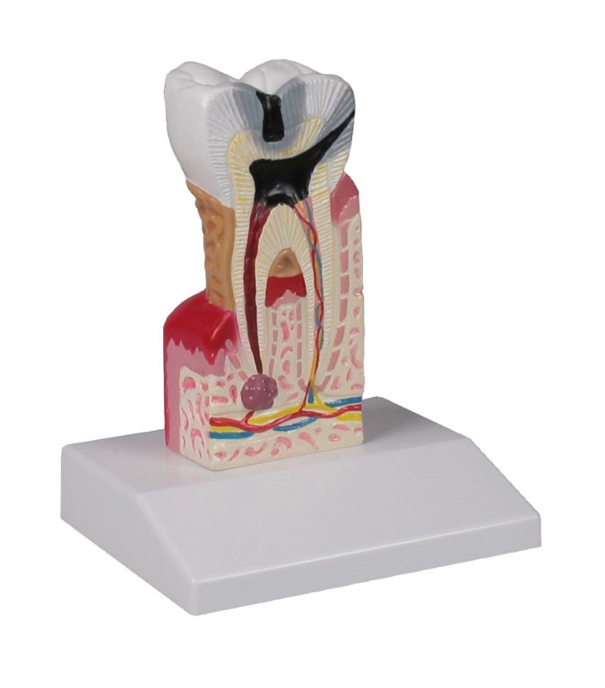 Unterer Molar mit Darstellung von Karies, Pulpaentzündung und Wurzelspitzenentzündung. Ebenfalls vorhanden sind Zahnstein und Zahnfleischentzündung. Normale Strukturen wie Kieferknochen, Nerven, Gefäße, Halteapparat, Zahnschmelz, Dentin und Pulpa sind selbstverständlich auch dargestellt.