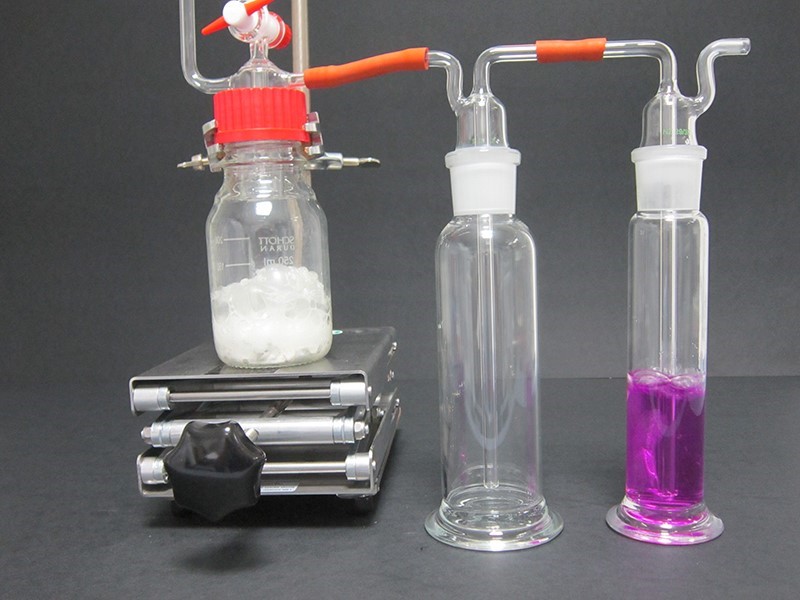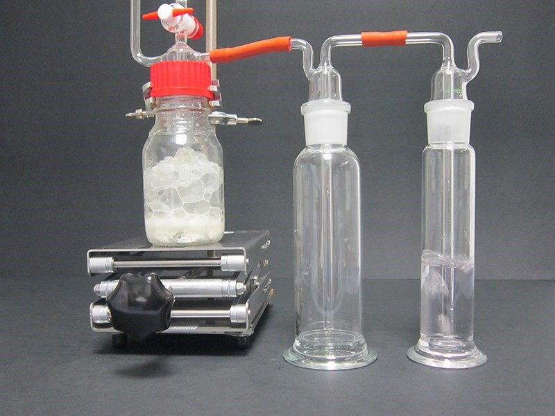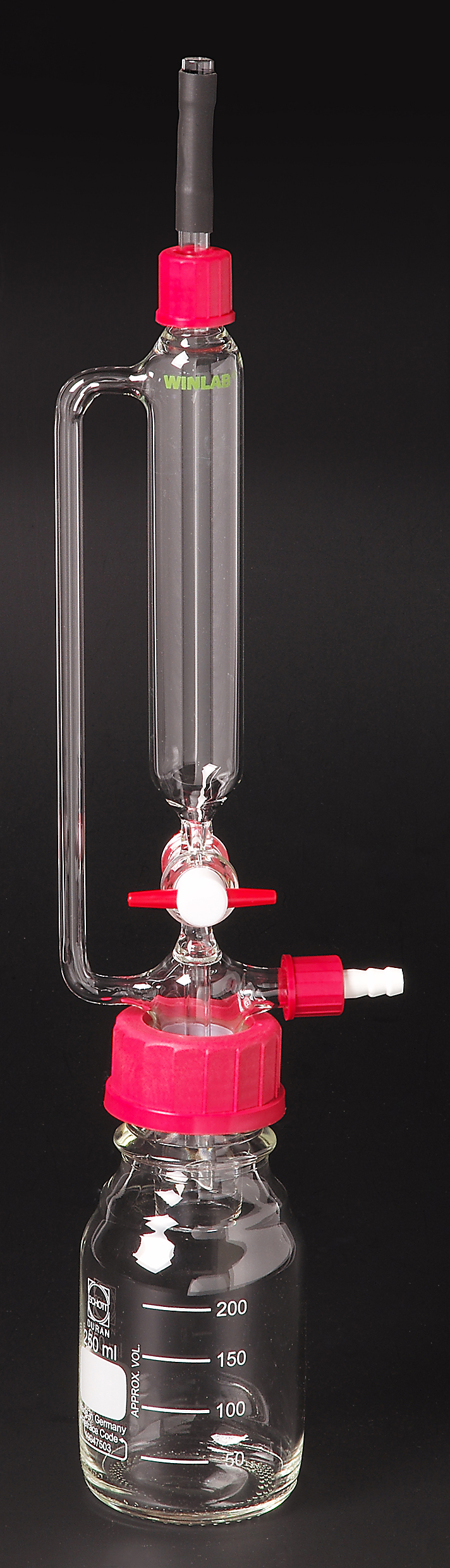 Der besondere Vorteil dieses neuen Gasentwicklers besteht darin, dass er kompakter gebaut ist (nur 2 Bauteile) und wegen der Schraubverbindung eine geringere Bruchgefahr aufweist, als Gasentwickler mit NS-Schliffverbindungen.