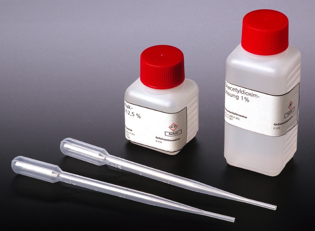 Der Testset wird komplett mit Versuchsanleitung, Kunststoffpipette und 50ml Ammoniaklösung und 100ml Diacetylglyoximlösung geliefert.