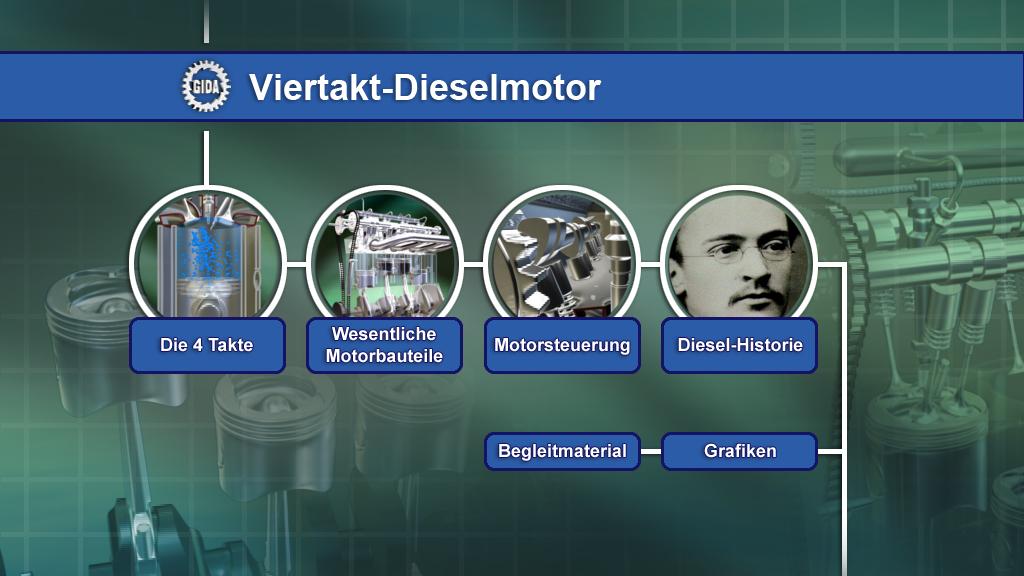 4 Filme zum Aufbau und zum Funktionsprinzip des Viertakt-Dieselmotors, optimal abgestimmt auf das erste Lehrjahr aller neuen fahrzeugtechnischen Berufe (Berufsschule, "Kennenlernen des Fahrzeugs") und auf das Thema "Motoren" im Physikunterricht der allgemeinbildenden Sekundarstufe I