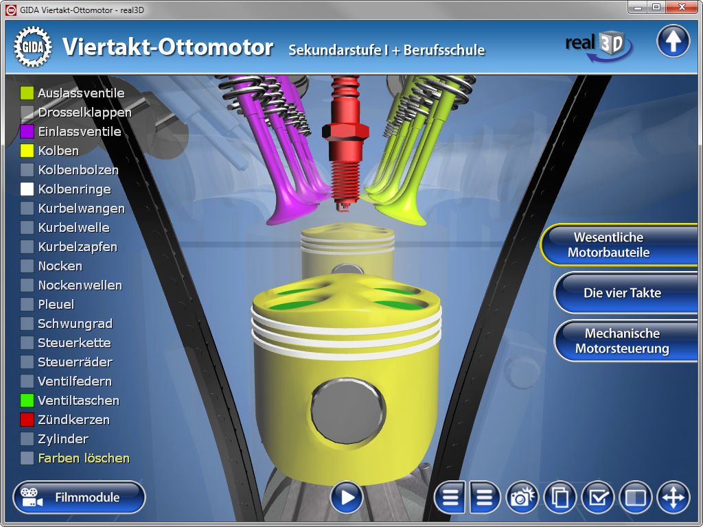 die real3D Software gibt Ihnen größtmögliche Vielfalt und Freiheit in der Bearbeitung des Themas "Viertakt-Ottomotor" und unterstützt viele individuelle Unterrichtsstile.