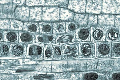 Weiterführende Links zu "Zellteilungen (Mitosen). Wurzelspitzen von Allium cepa, Küchenzwiebel, längs. Alle Teilungsstadien i"