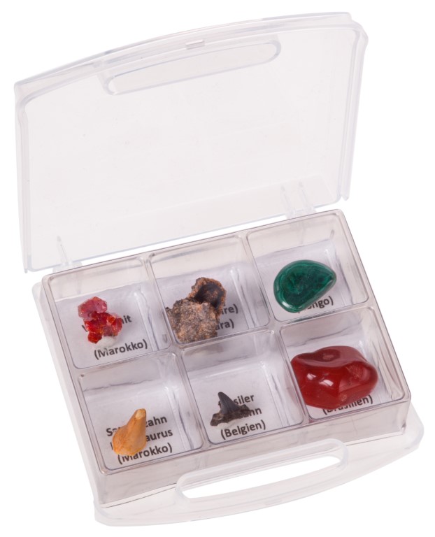 Satz Mineralien Bestehend aus 6 unterschiedlichen Mineralien/Fossilien in einer Schachtel 5x4 cm in 6 Fächer unterteilt.