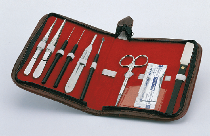 - 2 Pinzetten und Skalpell mit Ersatzklingen in Falttasche mit Reißverschluss.