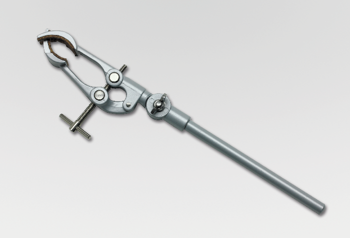 Runde Klemmbacken, mit Kork belegt, ineinander greifend. Dadurch lassen sich auch dünne Rohre oder Stäbe (z. B. Thermometer) gut halten. Leichte Ausführung aus Aluminium.