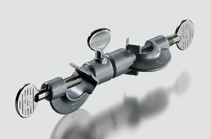 Zur drehbaren Verbindung von Stäben, mit zwei Klemmschrauben und einer Spannschraube für das Drehgelenk.