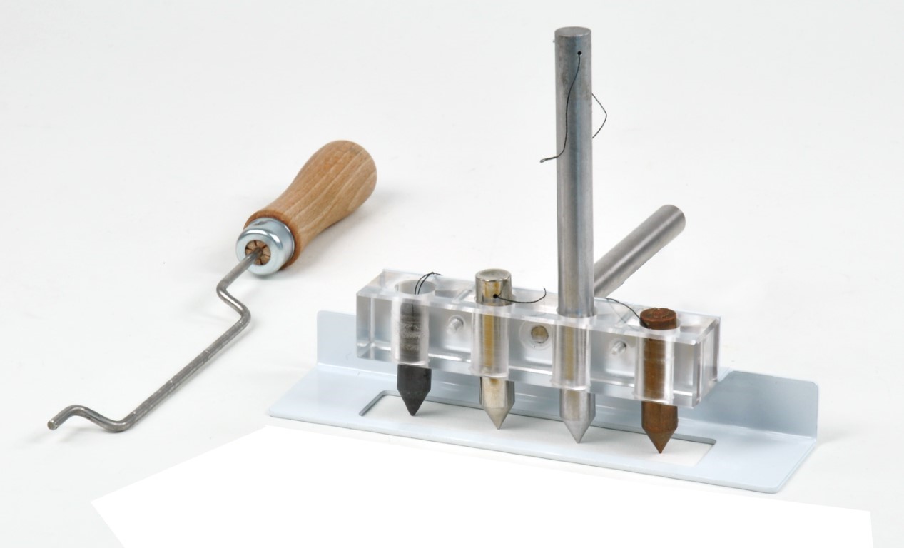 4 Metallzylinder mit Hebeschnüren, Pb/Cu/Al/Fe;
