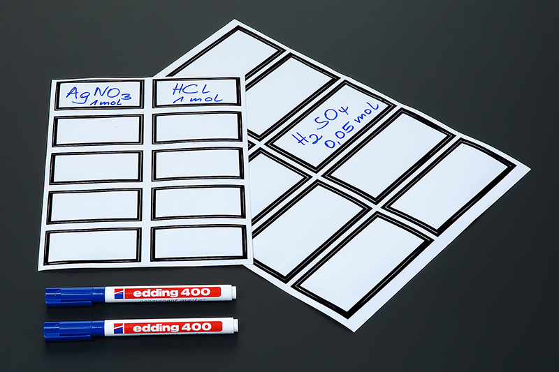 Aus reinweißer Spezialfolie, selbstklebend mit schwarzem Rand zum Selbstbeschriften. Die Etiketten sind lichtecht, alterungsbeständig, abwaschbar und weitgehend säure-, laugen- und alkoholbeständig.