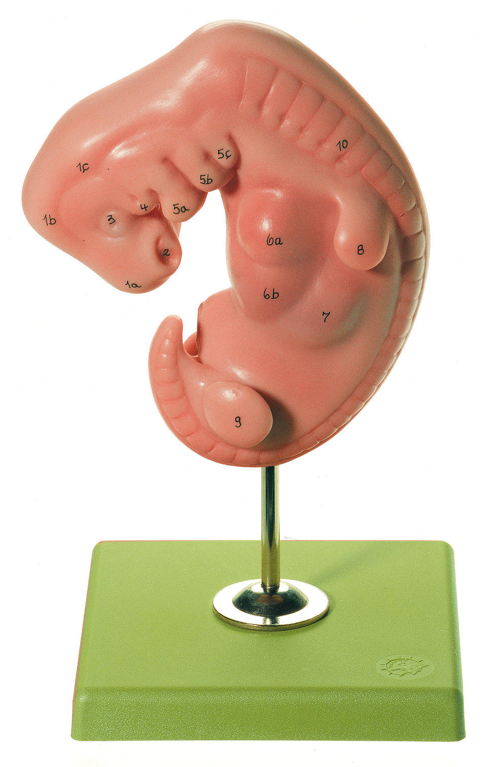 ca. 25fache Vergrößerung, aus SOMSO-Plast®. Das Modell zeigt einen etwa 4 Wochen alten Embryo. Unzerlegbar. Auf Stativ mit grünem Sockel.