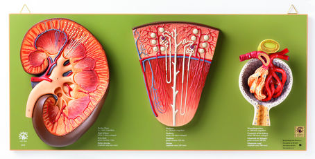 Niere ca. 3fach vergrößert, Nephron ca. 120fach vergrößert und Nierenkörperchen ca. 700fach vergrößert aus SOMSO-Plast.
