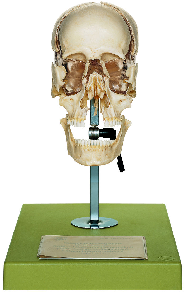 Naturabguß, aus SOMSO-Plast®. Naturgetreue Wiedergabe der Knochenstruktur in allen anatomischen Details. Alle Einzelknochen auf einer Kunststoffschale, der Schädelform entsprechend, montiert und abnehmbar: Stirnbein, Scheitelbein (2), Schläfenbein (2), Jochbein (2), Nasenbein (2), Hinterhauptsbein, Oberkiefer (2) mit Gaumenbein (2), Tränenbein (2) und untere Nasenmuschel (2), Pflugscharbein, Siebbein, Keilbein und Unterkiefer. Durch ein Gelenkstativ für Demonstrationen besonders geeignet. In 22 Teile zerlegbar.