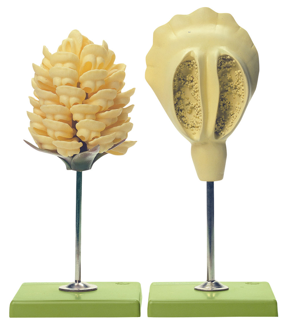 Pinus silvestris, Blüte ca. 18fach vergrößert, Staubblatt ca. 90fach vergrößert, aus SOMSO-Plast®. Nach Prof. Dr. Weber. Unzerlegbar. Auf Stativ mit grünem Sockel.