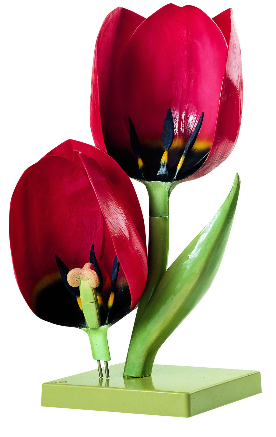 Tulipa gesneriana, ca. 4fach vergrößert, aus SOMSO-Plast®. Nach Prof. Dr. W. Jung und Prof. Dr. Weber. Nach Abnahme der halben Blütenkrone werden Staubblätter und Stempel sichtbar. Der Fruchtknoten ist zerlegbar und zeigt im Querschnitt die Samenanlagen.