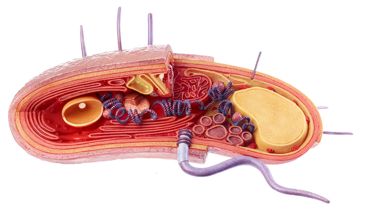aus SOMSO-PLAST®. Vergrößerung: 310.000:1. Begutachtung des Modells durch Prof. Dr. Uwe Hoßfeld, AG Biologiedidaktik, Bienenhaus, Friedrich-Schiller-Universität Jena. Unzerleg- und abnehmbar auf grünem Sockel montiert.
