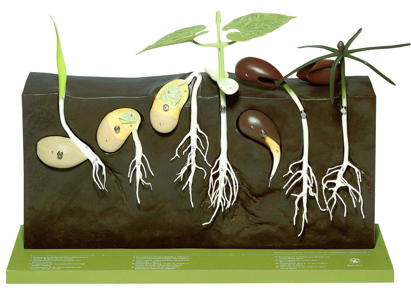 Eine vergleichende Zusammenstellung der Keimungen von Roggen (10fach vergrößert), Bohne (5fach vergrößert) und Fichte (20fach vergrößert). Aus SOMSO-Plast®. Nach Prof. Dr. W. Jung und Prof. Dr. W. Weber. Das Modell zeigt in anschaulicher Weise, daß 1. das Roggenkorn (Secale cereale) eine grüne Spitze aus dem Boden hervortreibt (Spitzkeimer - monocotyle Pflanze), 2. bei der Bohne (Phaseolus vulgaris) zuerst die beiden Keimblätter erscheinen (Blattkeimer - dicotyle Pflanze) und 3. die Keimpflanze der Fichte (Picea excelsa) aus der Erde hervorkommt, zuerst die Samenhülle abwirft und ihre Keimblättchen dann sternförmig ausbreitet.