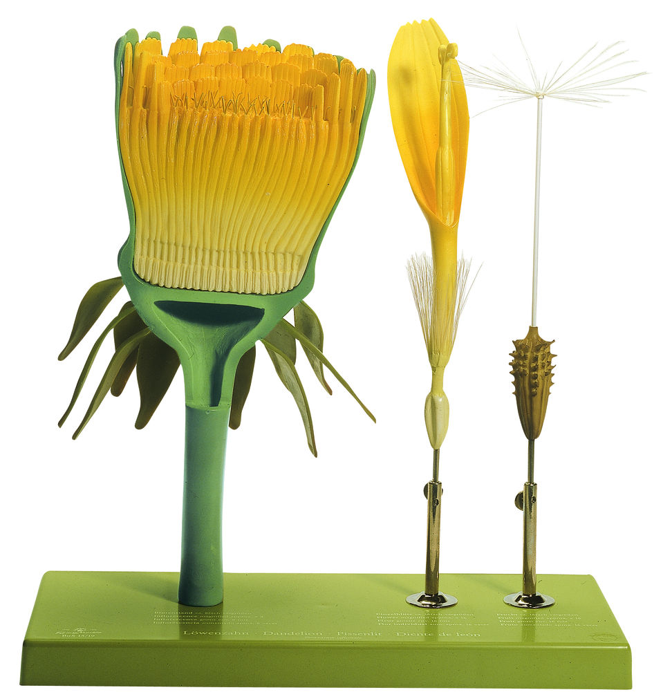 Taraxacum officinale, ca. 8fach vergrößert, aus SOMSO-Plast®. Nach Prof. Dr. Weber. Der Blütenstand ist im Längsschnitt dargestellt. Teilmodelle zeigen vergrößert eine einzelne Zungenblüte und eine Frucht mit dem Pappus. Einzelblüte und Frucht abnehmbar.