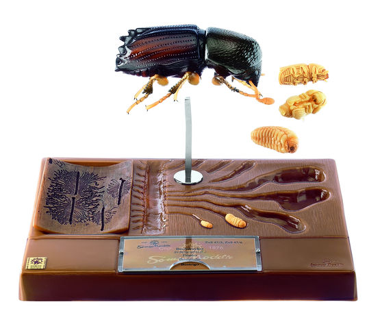 Ausführung wie ZoS 47/5, aus SOMSO-Plast®, jedoch mit folgenden Entwicklungsstadien: Ei, 2 x junge Larve, ausgewachsene Larve, Puppe und Käfer. Die Modelle liegen in einem Relief, das dem Fraßbild nachempfunden ist. Zusätzlich ist noch ein Fraßbild als Naturabguß enthalten. In 5 Teile zerlegbar. Auf grünem Sockel.