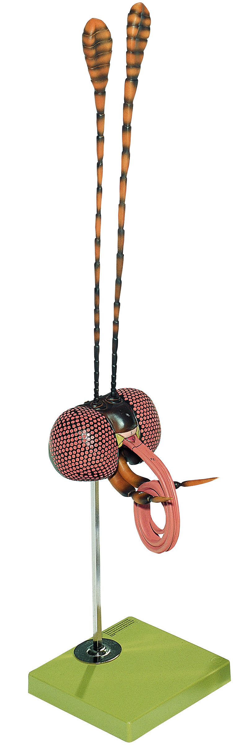 Großer Kohlweißling, Pieris brassicae, im Maßstab 50:1 nach der Natur modelliert, aus SOMSO-Plast®. Nach Dr. E. Schicha. Der Rüssel ist einmal im gestreckten und einmal im aufgerollten Zustand dargestellt. In 5 Teile zerlegbar. Auf Stativ mit grünem Sockel.