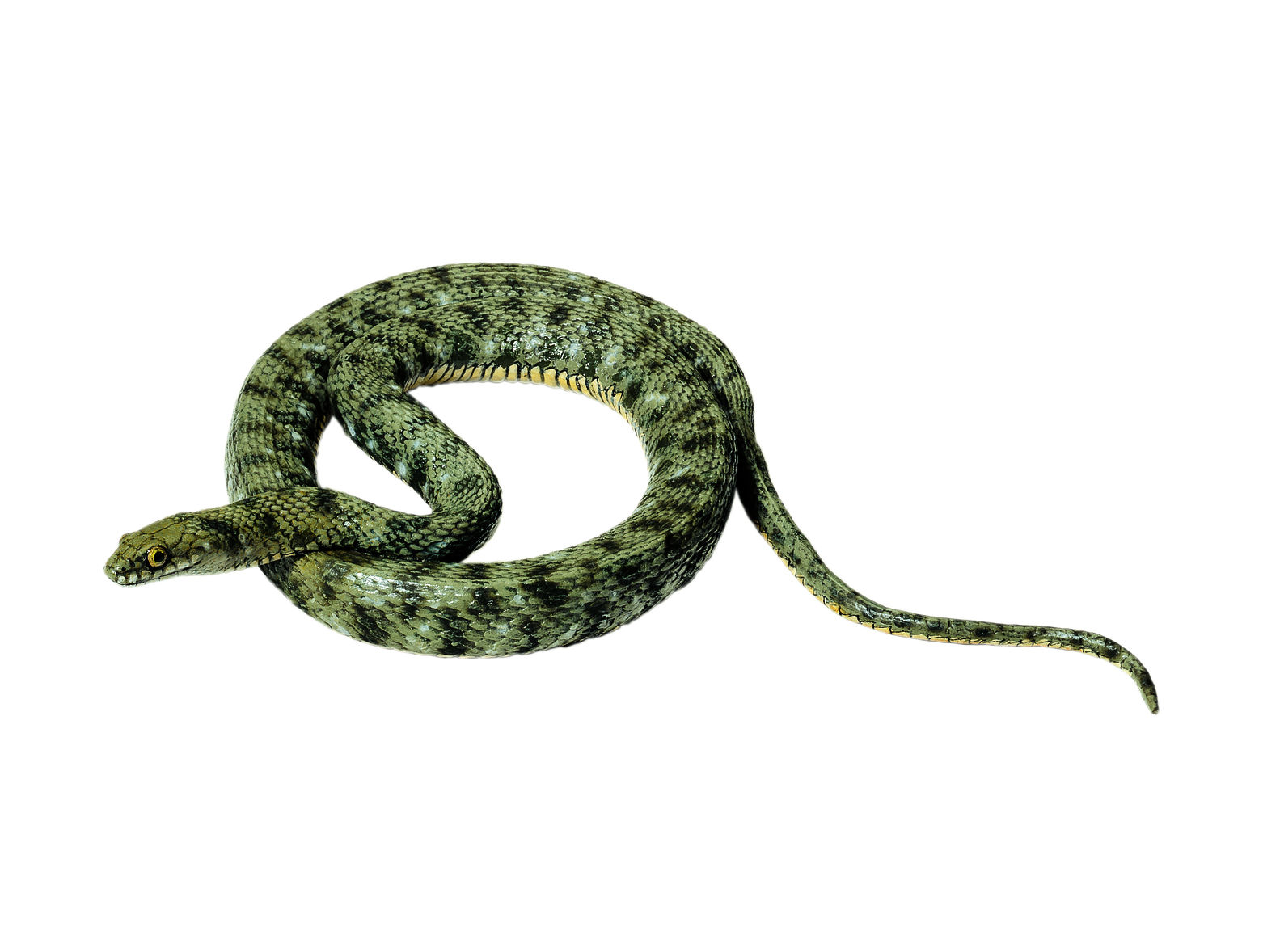 Natrix tesselata. In natürlicher Größe, aus SOMSO-Plast®. Nach Studiendirektor Christian Groß. Mit aufgedruckter Beschreibung auf grünen Sockel, unter einer transparenten Staubschutzhaube. Schachtelmaße: