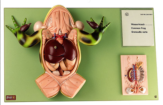 Rana kl. esculenta. Nach Studiendirektor Christian Groß. Abbildungsverhältnis 4:1, aus SOMSO-Plast®. Das rückenseitig auf grüner Grundplatte montierte Modell zeigt ein ventral geöffnetes Anatomiepräparat eines männlichen Tieres. Leber und Magen-Darm-Trakt können jeweils entfernt werden. Für Vergleichszwecke werden in einem Zusatzmodell die bauchseitig präparierten Harn- und Geschlechtsorgane eines weiblichen Wasserfrosches gezeigt. Insgesamt in 3 Teile zerlegbar. Auf grüner Grundplatte.