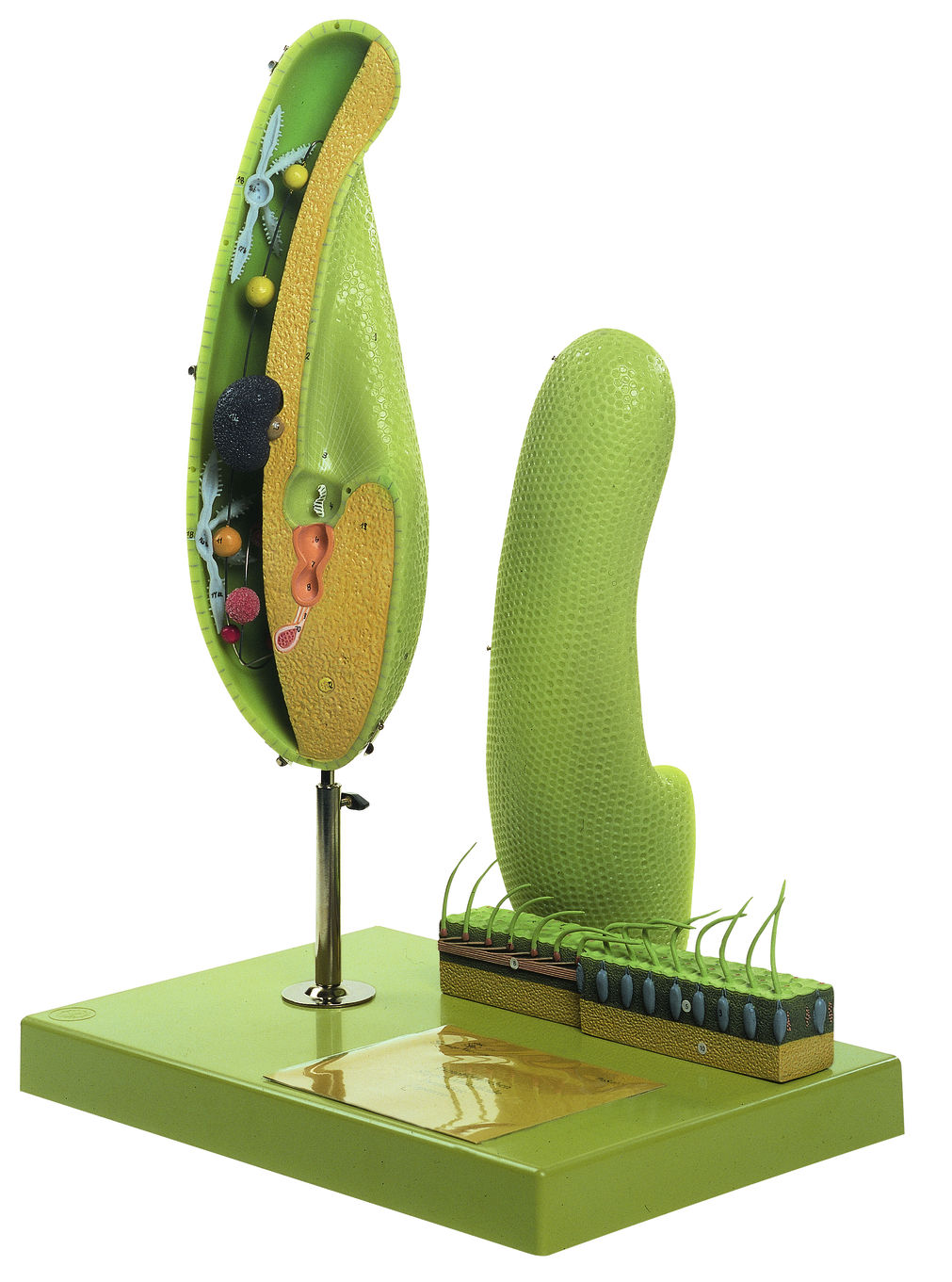 Paramecium, Vergrößerung ca. 1600fach, aus SOMSO-Plast®. Nach Studiendirektor Christian Groß. Das Modell zeigt das Zellinventar des Urtierchens: Makro- und Mikronucleus, kontraktile Vakuolen, Cytostom mit Membranellen, Schlundfäden und anschließender Nahrungszyklose, sowie Verteilung von Ento- und Ektoplasma und den Verlauf der neuromotorischen Fibrillen. Ein Detailblock veranschaulicht die Pelliculastruktur des Ektoplasma, Lage und Anordnung der Trichocysten und zeigt eine Cilienreihe in typischer Schlagfolge. In 2 Teile zerlegbar, auf Stativ mit grünem Sockel und Beschreibung.